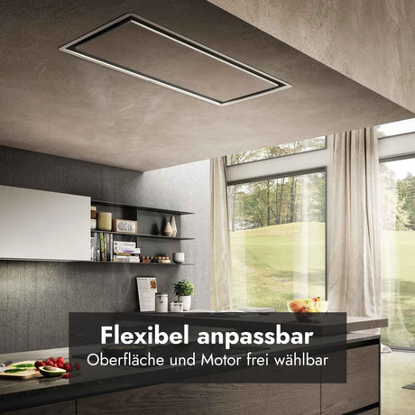 Der Deckenlüfter wird direkt in die Raumdecke oder in eine abgehängte Decke eingebaut. Wichtig ist, dass er sich in einer Höhe zwischen 1,40 und 1,60 Metern über dem Kochfeld befindet, damit er effektiv arbeiten kann.