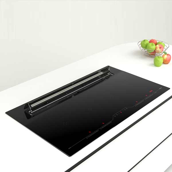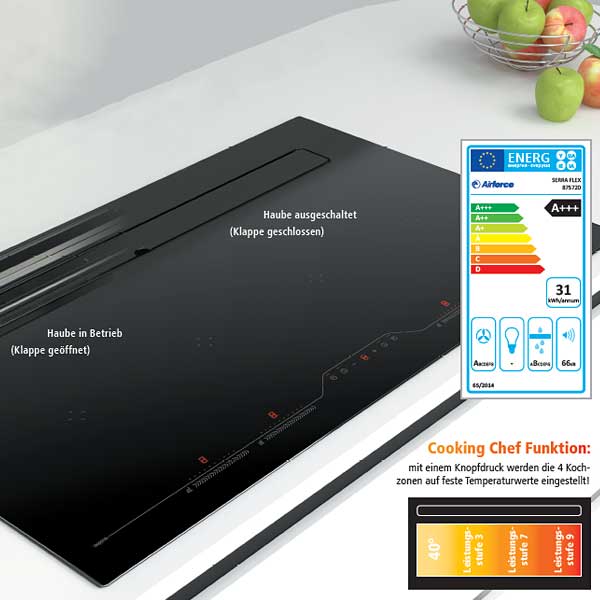 Das kompakte Panorama-Kochfeld mit leistungsstarkem Abzug: Für jede Kochzone können 3 Temperaturstufen (40°/70°/98°) fest eingestellt werden. Bei Kochinseln ist der Einbau in nur 60 cm tiefe Arbeitsplatten möglich. Bei der "Cooking Chef Funktion" können mit einem Knopfdruck die 4 Kochzonen auf feste Temperaturwerte eingestellt werden. Die Luftleitklappe des Dunstabzugs öffnet und schließt auf Knopfdruck.